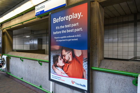 Featured across regional transit networks, including buses, stations, and public walls, reaching diverse urban audiences. Also featured on The Tyee (Dec 2024) in the article “Time to Get Tested: Fraser Health Confronts Rising Syphilis Cases.